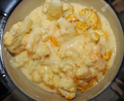 Turn the heat to low and stir in the table salt, the other 1/4 tsp of the pepper and all but 2 tbsp of the cheese. Once the cheese melts in, add in the parmesan cheese. The mixture will continue to thicken as it cooks; stir it frequently. You can leave it over low heat until the cauliflower is done in the oven as long as you continue to stir often.