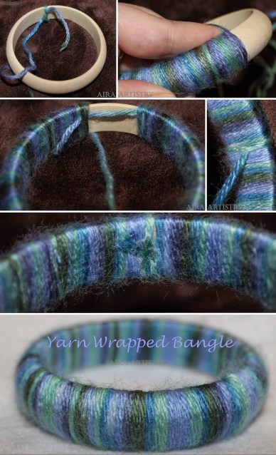 Today I had every intention of making one of those straw bracelets, but even though I swore up and down I had picked up straws at one point, I couldn’t find them anywhere. Since I already had cut a large length of yarn, I decided to use one of my leftover wooden bangles and wrap it!