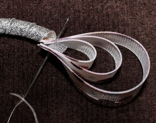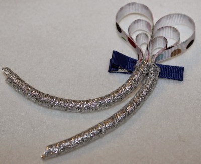 Today’s project was a Balloon Ribbon Sculpture. For this you need some 3/8″ grosgrain ribbon (for the balloons) as well as 1/4″ or 1/8″ grosgrain or silk ribbon (for the tails). Cut 2″, 3″ and 4-4.5″” lengths of your balloon colors and nest them inside each other. The balloon tails (I used korker ribbon for mine) should be about 3-4″ long. You can either hot glue or stitch the pieces together!