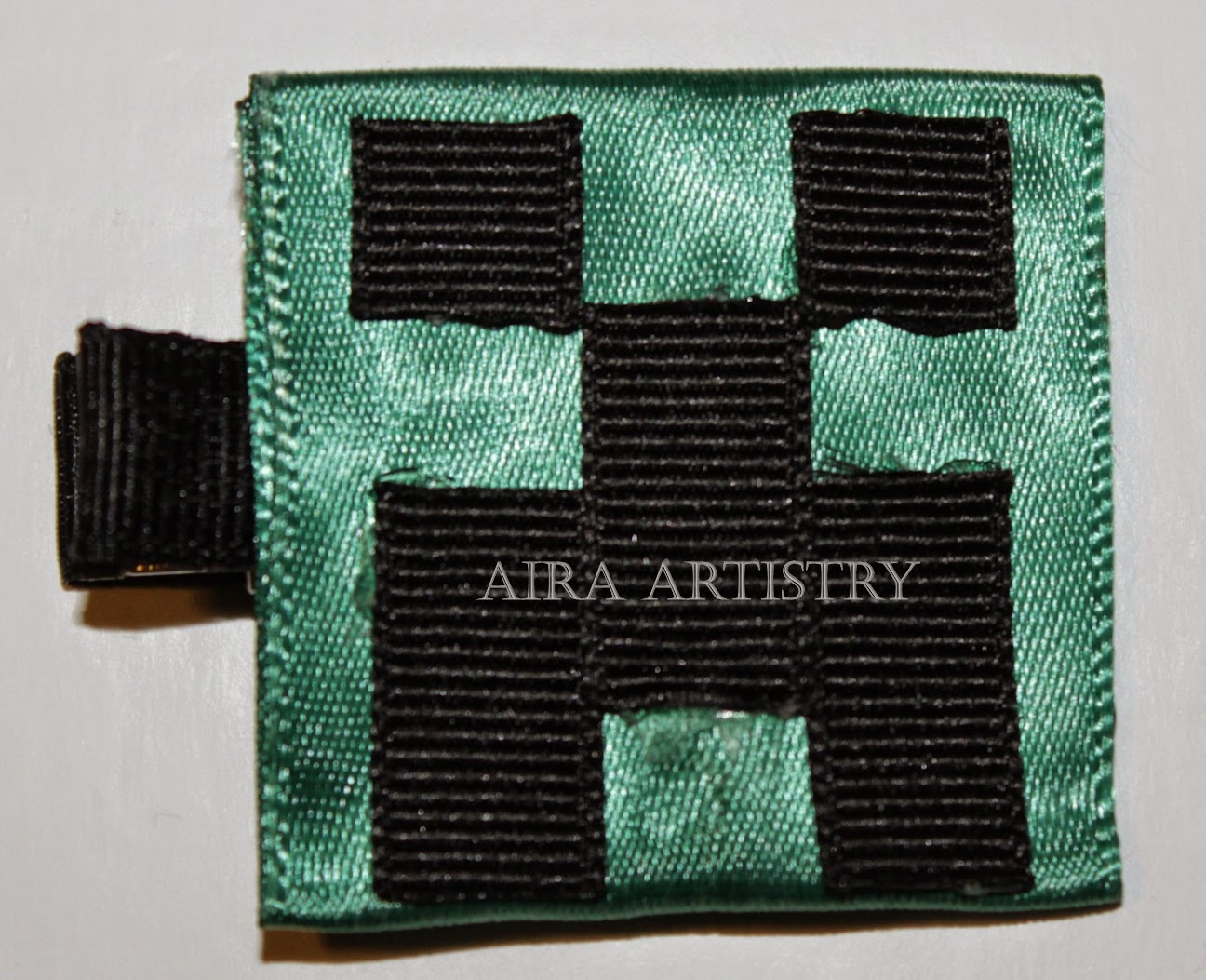 For the creeper’s body I used 1 1/2″ wide green silk ribbon, cut to about 3 1/4″ long, then folded to be 1 1/2″ long (so it was 1.5″x1.5″) with some overlap to cover the open end, as shown below. I also closed up the sides with a light layer of glue. You could use grosgrain ribbon instead, and 2×2 may actually be better for this if you can find that size.