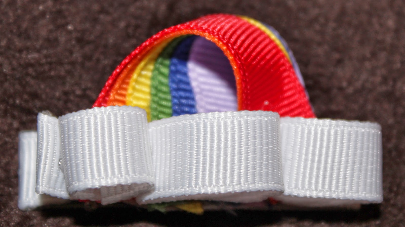 Finally, glue the connected rainbow ends onto the clip, and cut white grosgrain to two 1 1/2″ lengths and one 2″ length. Glue the ends together to make rolls for each length, then glue them onto the clip, forming your clouds.