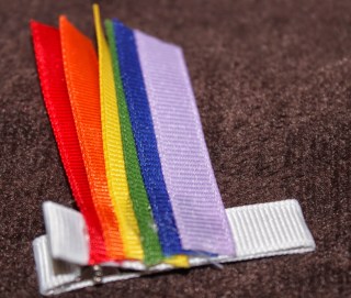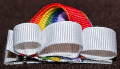 Today’s project was a Rainbow Clippie. You’ll need 3/8″ grosgrain ribbon in red, orange, yellow, green, blue, purple and white.