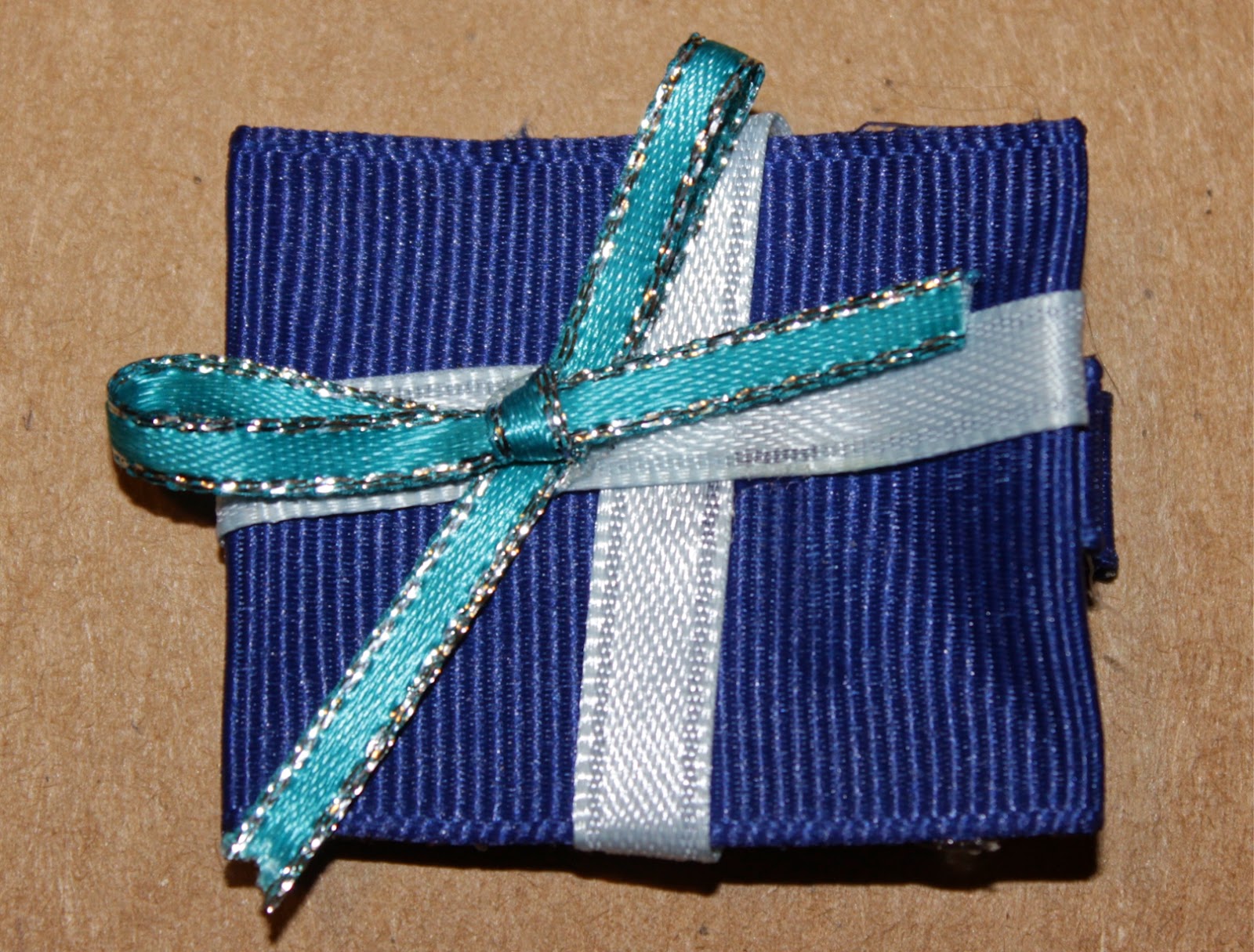Today’s project was a Present Clippie. For this you need 1.5″ grosgrain ribbon (for the present), 1/4″ ribbon (for the ribbon wrapped around) and 1/8″ silk ribbon (for the tiny bow). The lengths of these will depend on how large you want to make the present, though I recommend about 2-3″ long for the 1.5″ ribbon.