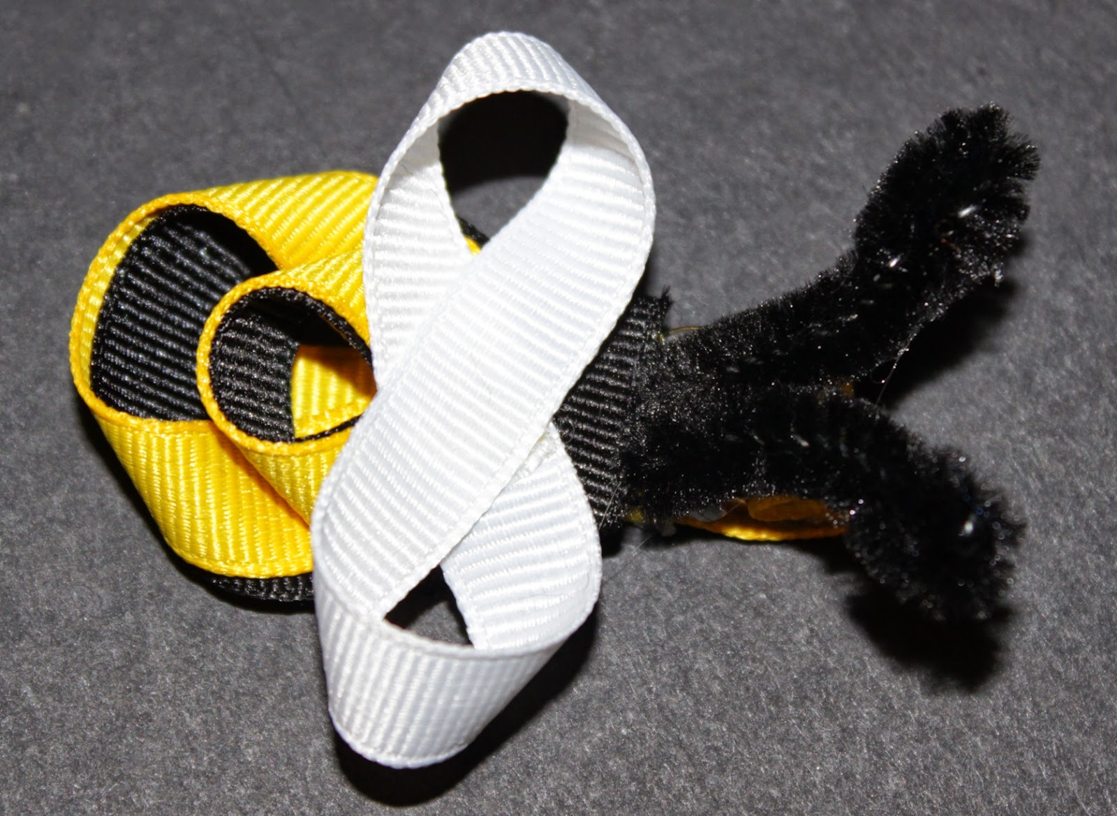 Today’s project was a Bumblebee Ribbon Sculpture. Its body uses looped yellow and black 3/8″ grosgrain ribbon. The wings are white 3/8″ grosgrain in a figure eight shape, and the antennae are black pipe cleaners, slightly curved.
