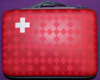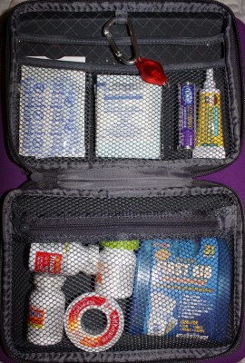I know this pictured first aid kit (similar) is a bit larger than the normal person needs (in general, the standard little blue kit you can see inside my bigger kit would be fine) but after having way too many foot problems this year and a recent procedure with after-care needed this month, I decided to be a bit more prepared. I can fit in bandaids (inside the smaller blue kit), tyenol/motrin/allergy pills, antibiotic cream, cloth tape, gauze, etc. The case zips closed easily (below) and is still light and easy enough to pack up. The case I got for free from Target with the purchase of three first-aid related items (gauze, band-aids and cloth tape, oh my!), and I’ve seen similar deals in my local Walgreens.
