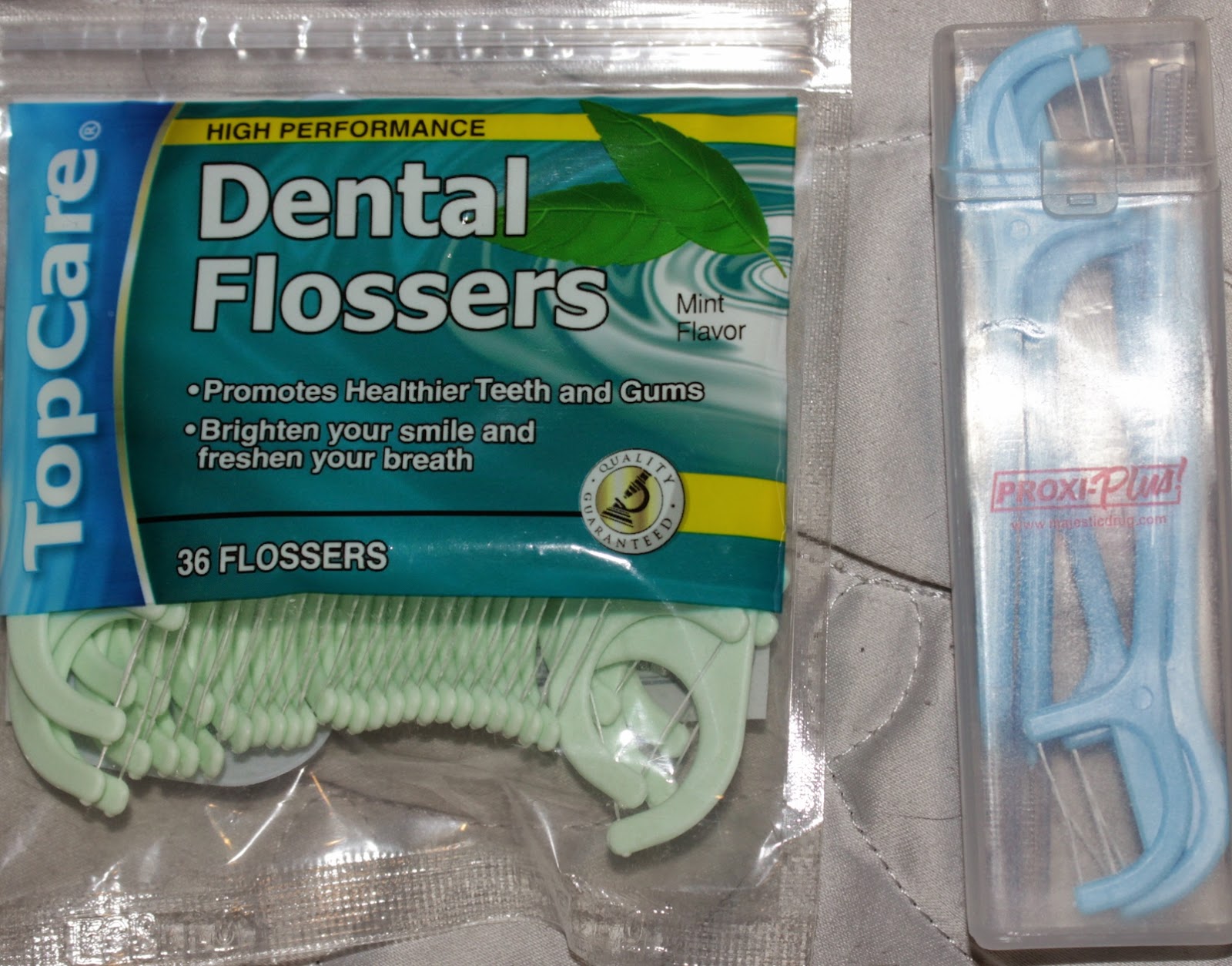 At home I use a WaterPik, but when I’m traveling I like to take dental flossers with me. Normally I tote around a full flosser bag (above, left) but a few weeks ago I saw a Proxi-Plus flosser kit on clearance at Walgreens (similar), so that will be my new compact travel kit for flossing. Taking the whole bag or using a snack baggie works just fine, too, though!