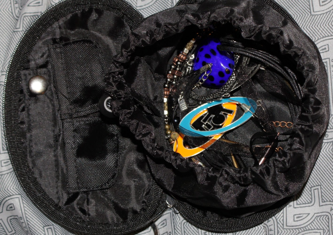 While pill boxes won’t fit larger pieces of jewelry, most standard earrings and rings, as well as smaller bracelets and necklaces, will fit into them. Not only does this make it easy for being on-the-go but it also staves off the inevitable tangling that usually follows travel. For larger jewelry, I use a small beading pouch I got from Michaels several years ago (pictured below). It zips up into a nice oval!