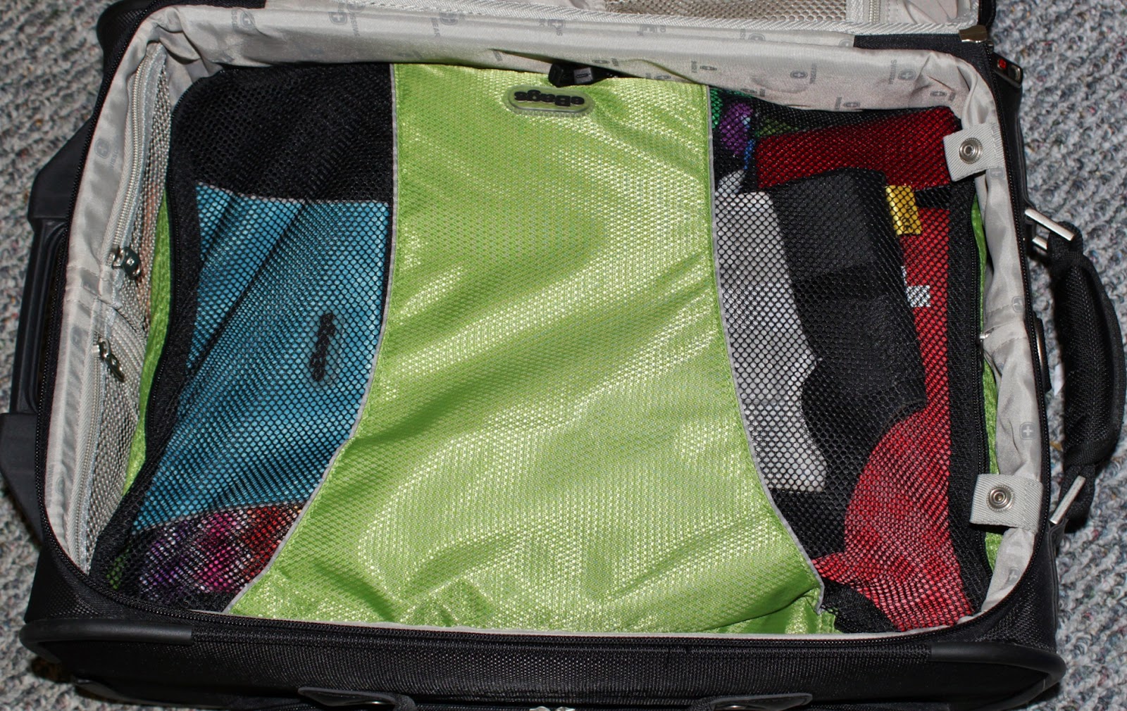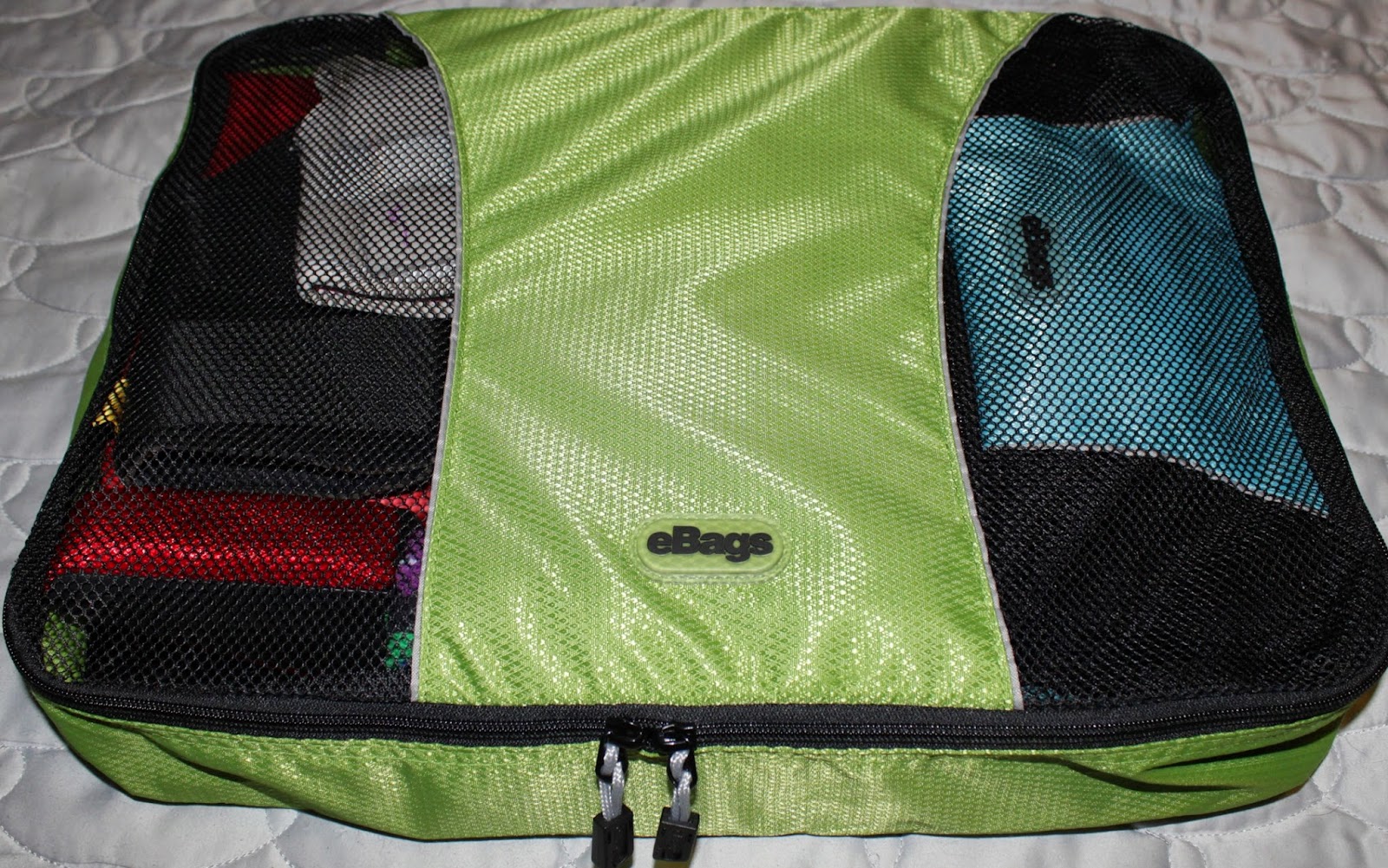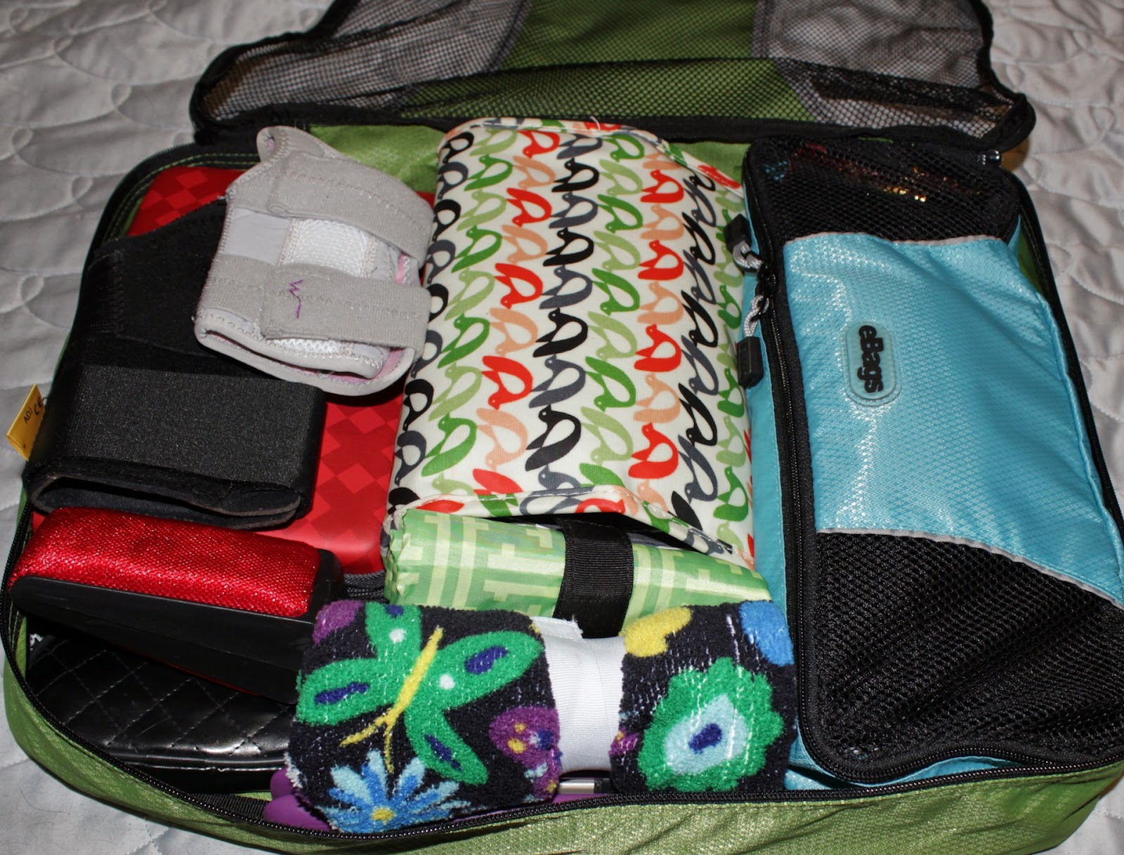 Pictured above is a large eBags cube (link) with a slim-sized cube (link) carrying all my electronic accessories, a toiletry bag, a full-sized first aid kit, a hair towel, a hair straightener, a wrapped up tote bag, a lint brush, a small pouch and my ankle and wrist braces. One of these large bags can also hold about 5-6 days worth of clothing for me, including an extra pair of jeans and 1-2 ‘nice outfits’ in case I go somewhere not t-shirt and jeans appropriate.