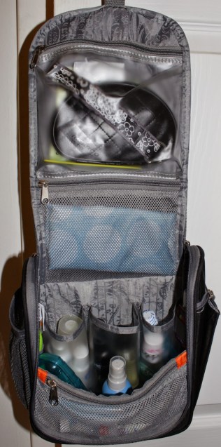 The case doesn’t take up much room and once you’re at your destination it hangs on a hook. Here’s my older case (link), which I’ve had for 5 years, taken on several trips, is a bit roomier and closes with a zipper: